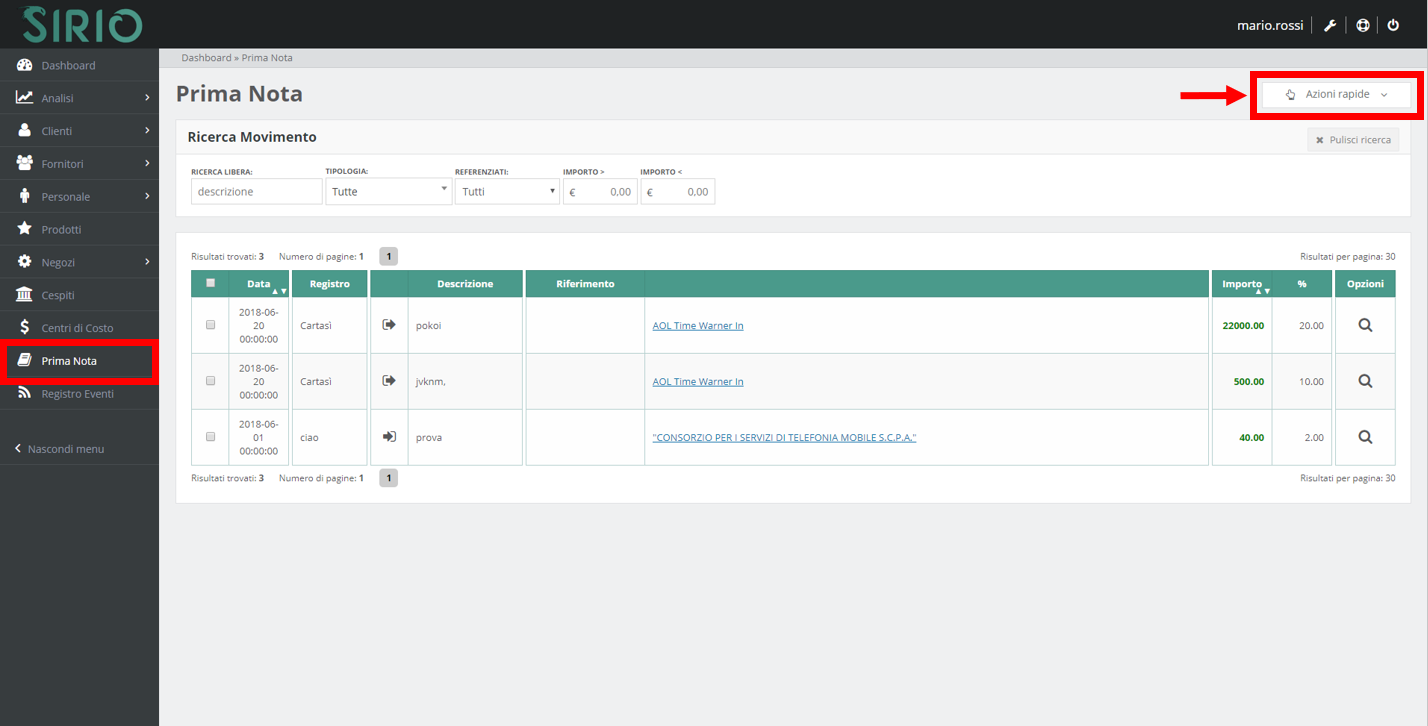 Per inserire manualmente un movimento contabile, accedere all'area PRIMA NOTA del menù principale e selezionare dal menù a tendina in alto a destra Azioni rapide l'opzione Gestione registri.