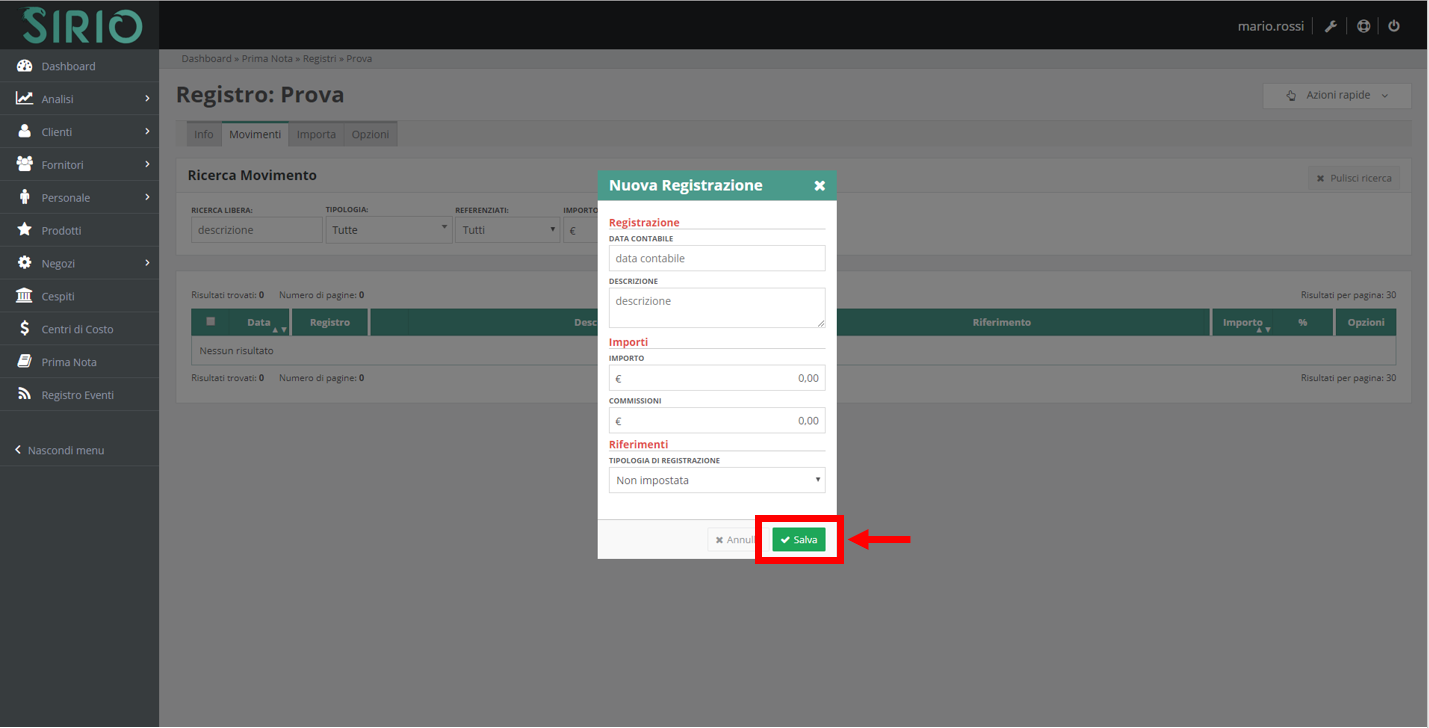 Dopo aver inserito tutti i dati della registrazione, salvare cliccando sul pulsante verde Salva alla fine della scheda.