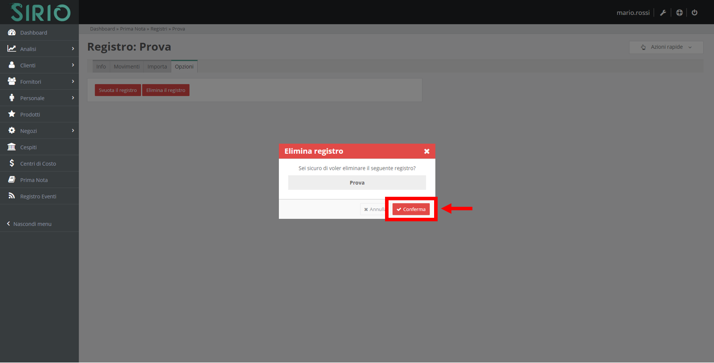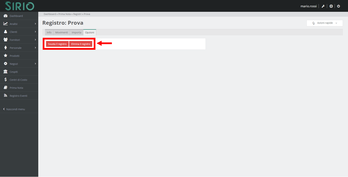 Per svuotare il registro, ovvero per cancellarne tutti i movimenti, cliccare sul pulsante rosso Svuota il registro.
