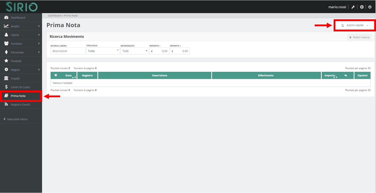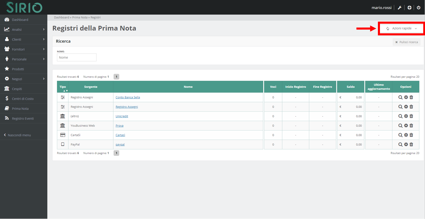 Per creare il registro della Prima Nota, accedere all'area PRIMA NOTA del menù principale. Da qui, selezionare dal menù a tendina in alto a destra chiamato Azioni rapide l'opzione Gestione Registri.
