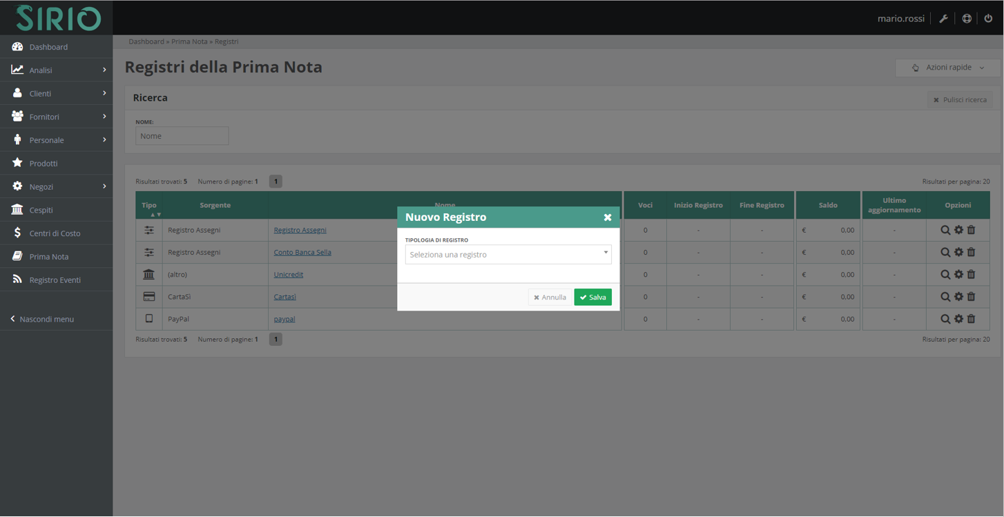 Una volta entrati nell'area Registri della Prima Nota selezionare dal menù a tendina in alto a destra Azioni rapide la dicitura Nuovo Registro.