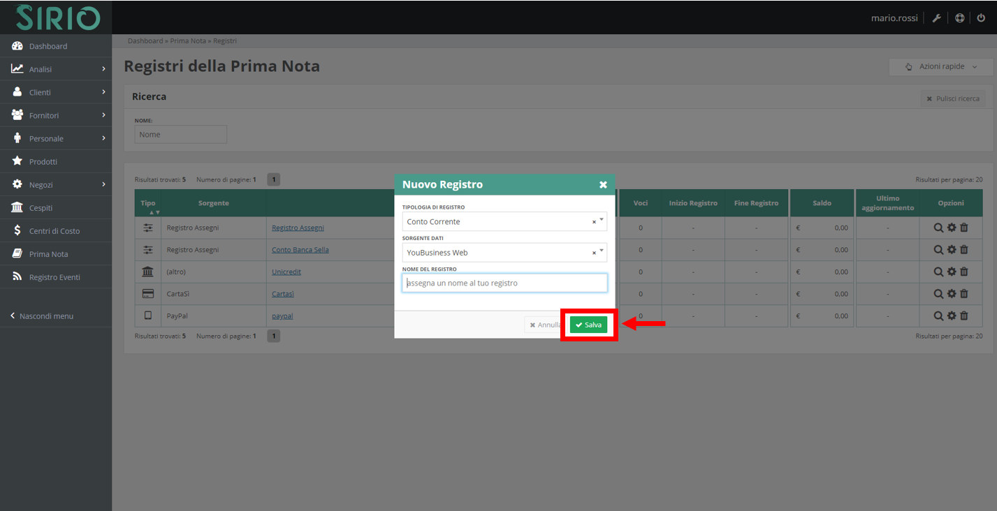 Quindi cliccare sul pulsante Salva in basso alla scheda Nuovo Registro per salvare il registro all'interno di Sirio.