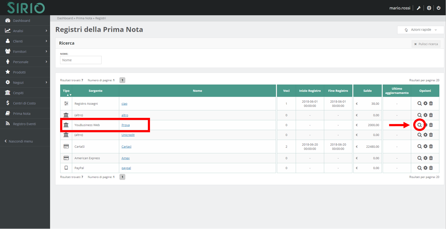 2.1) Per importare un Estratto Conto all'interno di Sirio, cliccare sull'icona lente d'ingrandimento alla destra del Registro a cui si vogliono aggiungere le scritture contenute nell'Estratto Conto.